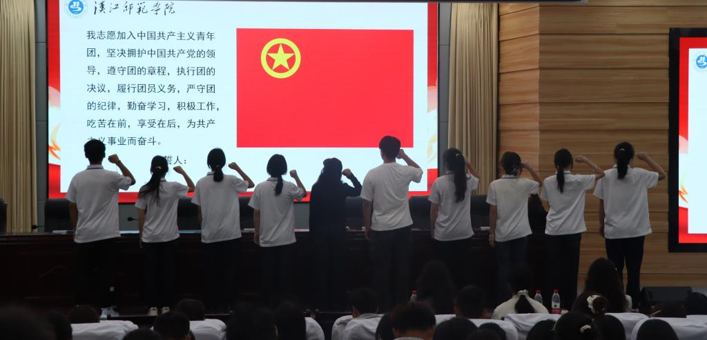 仪式在庄严的国歌声中拉开帷幕,全体参会人员肃立奏唱国歌,激昂的旋律点燃了在场每一位青年的爱国热情。随后,院分团委副书记朱晨昱宣读新发展团员名单,曾美玲、张慧珊、何玉等16名同学经过严格考察,光荣地被批准加入中国共产主义青年团。在新团员代表曾美玲同学的带领下,新团员们右手握拳高举过肩,庄严宣誓。随后,优秀团员代表为新团员佩戴团徽。当闪耀的团徽佩戴在左胸前时,新团员们深切感受到共青团员身份所承载的责任与荣光。