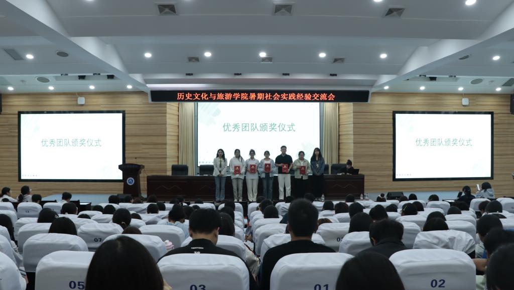 优秀个人代表的分享同样精彩纷呈。孙梦林分享了从爱心托管班服务到社会组织调研的转变,讲述自己从“接收者”成为“给予者”的成长:在服务中体会团队协作的重要性,在调研中深化对基层治理的理解,专业能力与社会认知同步提升。她特别强调,教育关怀的力量与理论联系实际的价值,为同学们提供了实践参照;丁宇航回顾了暑期参与的三场实践活动:从武汉抗战历史探索到遵义长征路重走,再到羽毛球赛事裁判工作,多元经历让他深刻理解了历史厚重、信仰力量与责任担当,不仅提升了沟通协调能力,更坚定了作为未来教育者的使命感。“让青春在坚守中绽放光彩。”他的感悟引发在场学子共鸣;张雨欣则带来了跨领域实践的丰富经验:在东风汽车博物馆开展志愿讲解,传承工业文化;参与跨校联合实践,提升协调能力;考察竹溪楚长城,深耕历史研究。她不仅展示了实践成果,更向同学们发出“五年百村”社会实践邀请,呼吁大家以行动服务社会。