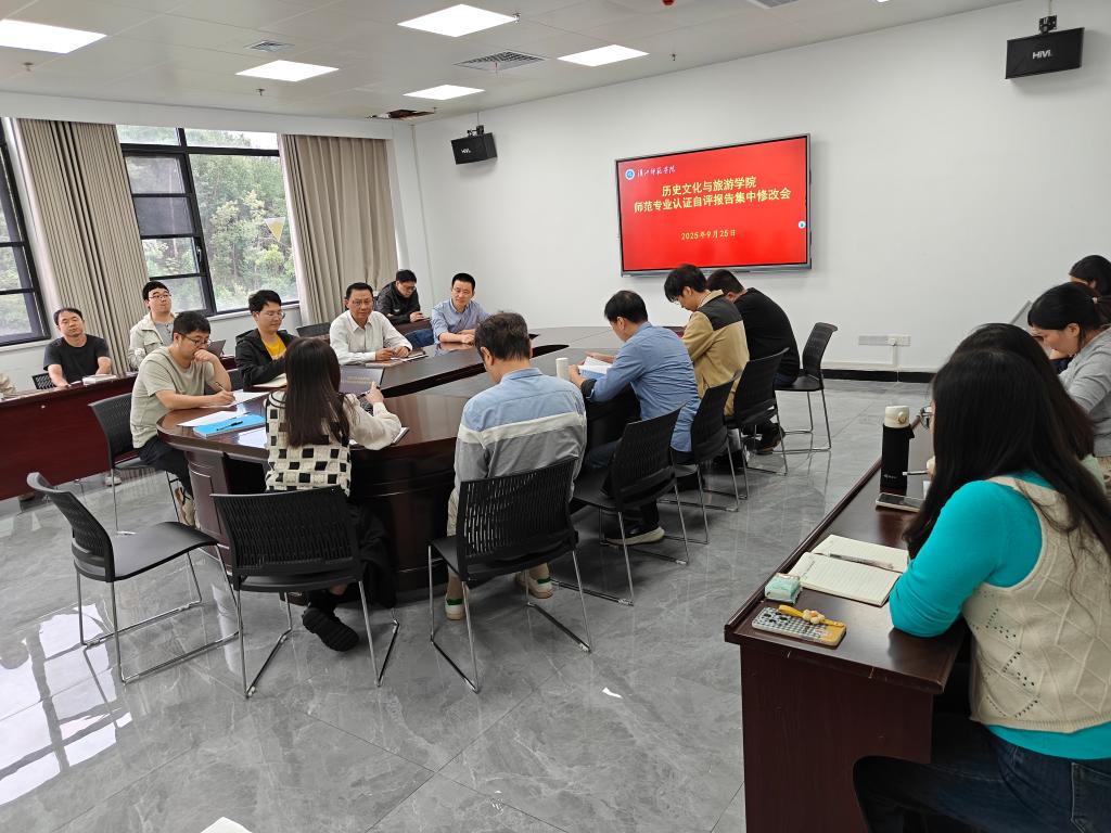 随后,分管教学的廖兆光副院长就自评报告的进一步修改完善工作进行了详细部署和专题辅导。他结合前期自查和专家反馈意见,对自评报告各部分内容进行了梳理,重点分析了当前存在的薄弱环节和亟待改进之处。他要求各模块负责人和全体教师,要严格对照认证标准,秉持精益求精的态度,对自评报告进行再打磨、再深化、再提升,尤其要在人才培养目标与毕业要求的达成度、课程体系对毕业要求的支撑度、师资队伍与教学资源的保障度、学生与社会用人单位的满意度以及质量持续改进机制的有效度等方面,进一步挖掘亮点、凝练特色、补齐短板,确保自评报告逻辑清晰、数据详实、举证有力、特色鲜明,真实、全面、充分地展现我院历史学师范专业的建设成效与改革成果。会议期间,与会教师就自评报告修改中的具体问题进行了深入研讨和交流。